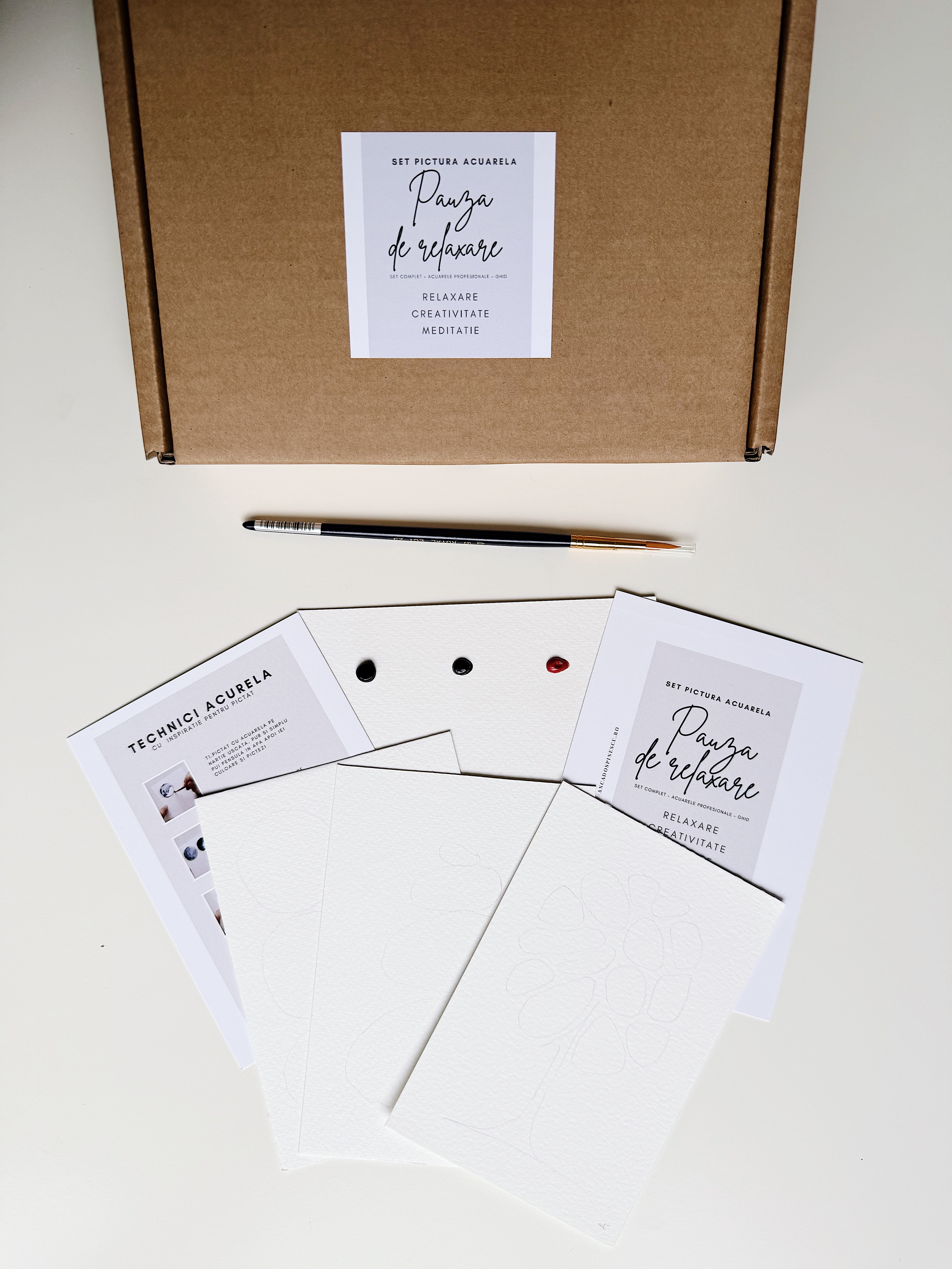 Am creat Setul de pictura Pauza de relaxare special pentru tine – un pachet de inceput conceput sa te ajute sa faci primii pasi in pictura in acuarela, folosind materiale profesionale.