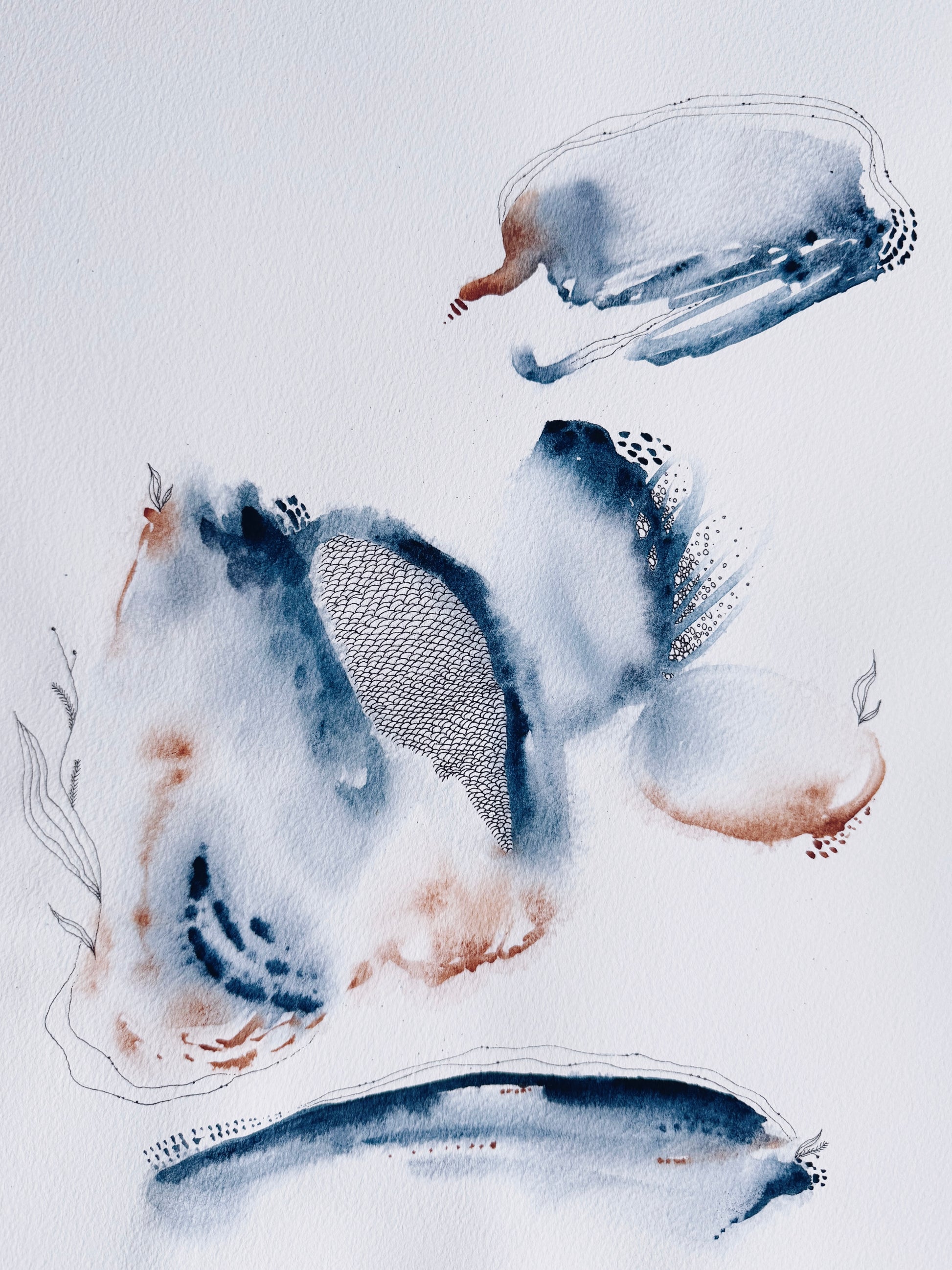 Această colectie a fost realizată în decembrie 2024, în timpul alegerilor din România, într-o perioadă în care aveam grijă si de fetița mea de 8 luni. Trăiam un amestec de depresie și anxietate, iar pictura a devenit refugiul meu pentru a mă relaxa și a respira mai ușor. Atunci am creat seria Indigo Breathings. Aceste lucrări m-au ajutat să mă regăsesc și să-mi amintesc de lucrurile bune din viața mea, pentru care sunt recunoscătoare.