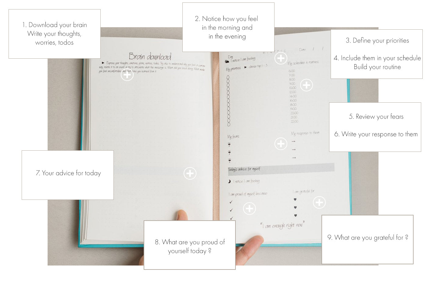 Jurnalul Meu e un mix autentic intre un jurnal personal si o unealta de productivitate, un jurnal ghid de autocunoastere, planner lunar, saptamanal si zilnic.
