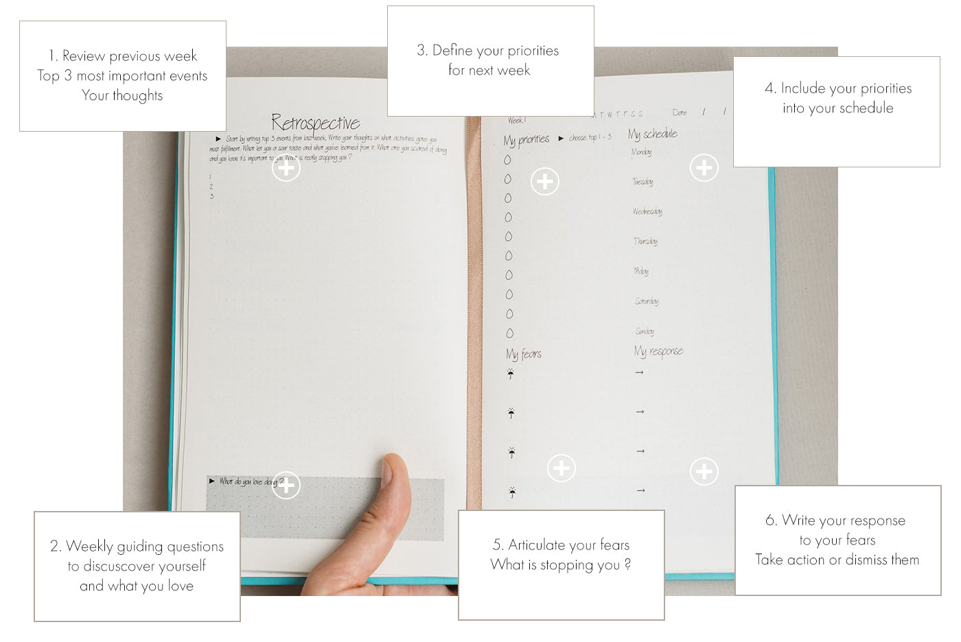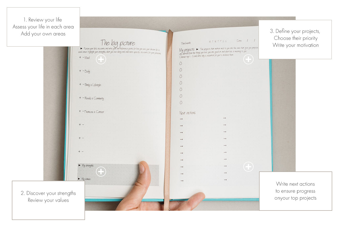 Sectiunile si intrebarile te vor asista sa identifici si sa articulezi ce e esential pentru tine. Te va tine focusat sa progresezi ceea ce e important revizuind si ajustand periodic.