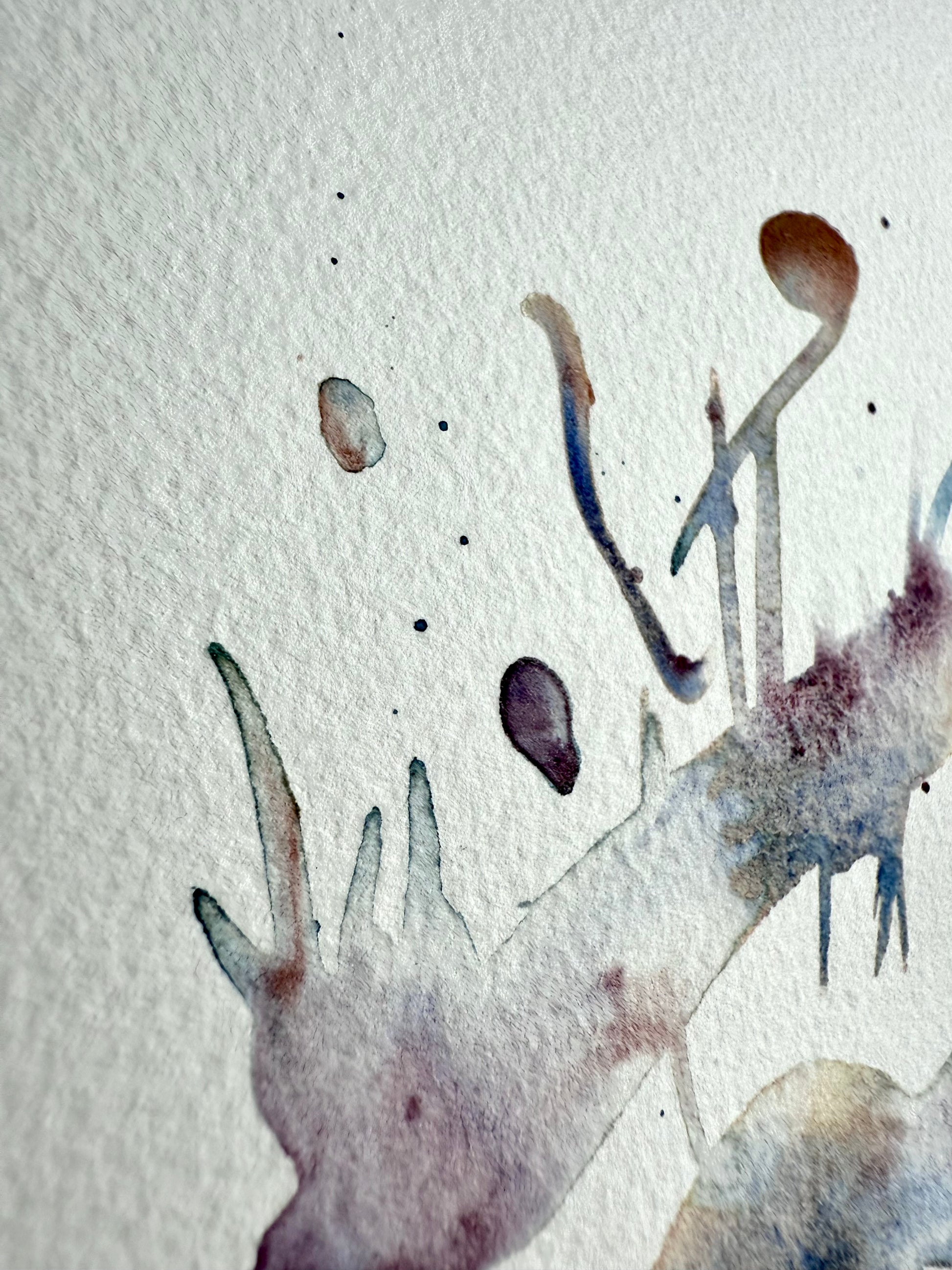 Pictată pe hârtie profesională pentru acuarelă, 300g, textură medie.