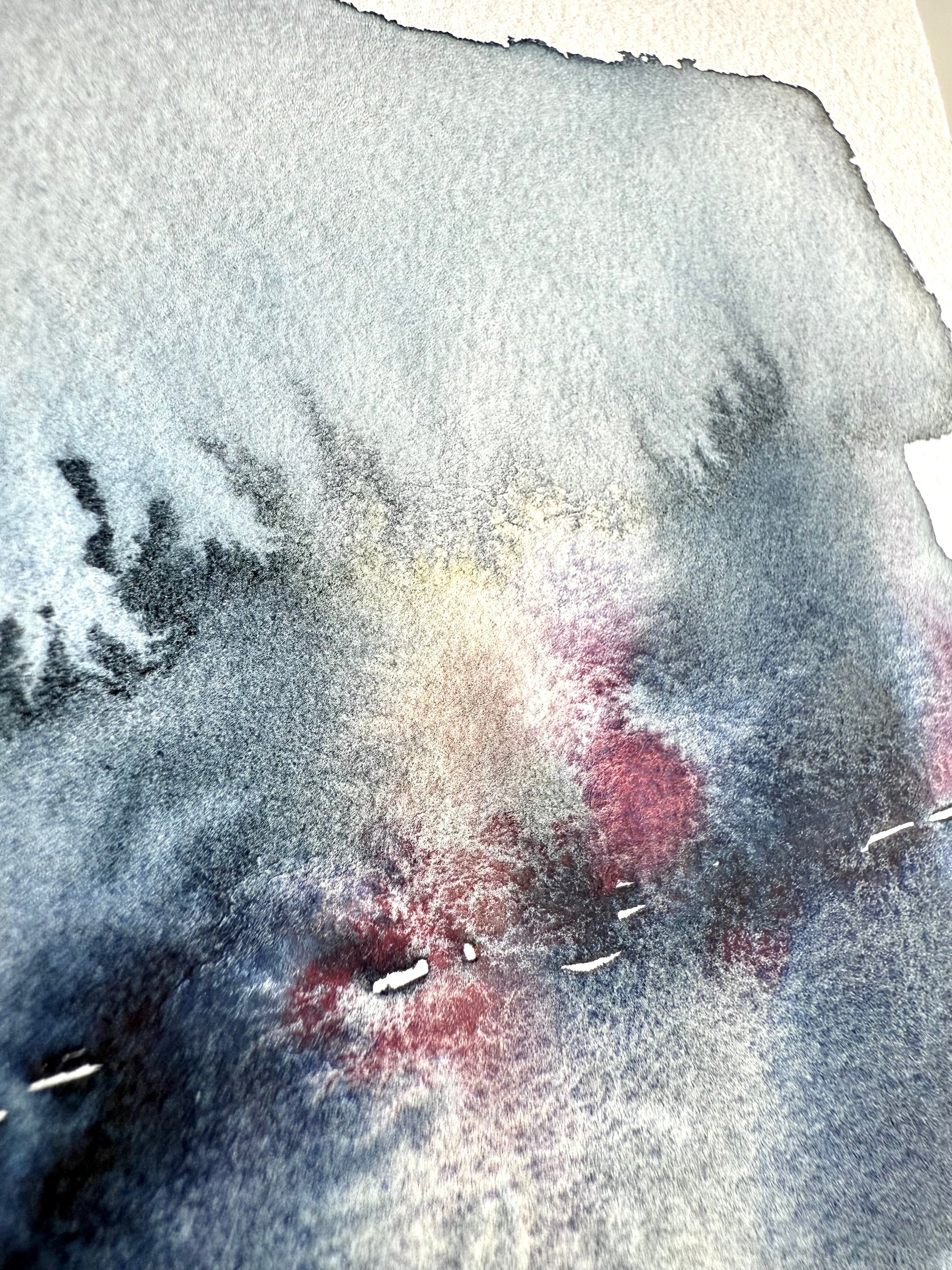 Pictată pe hârtie profesională pentru acuarelă, 300g, textură medie.