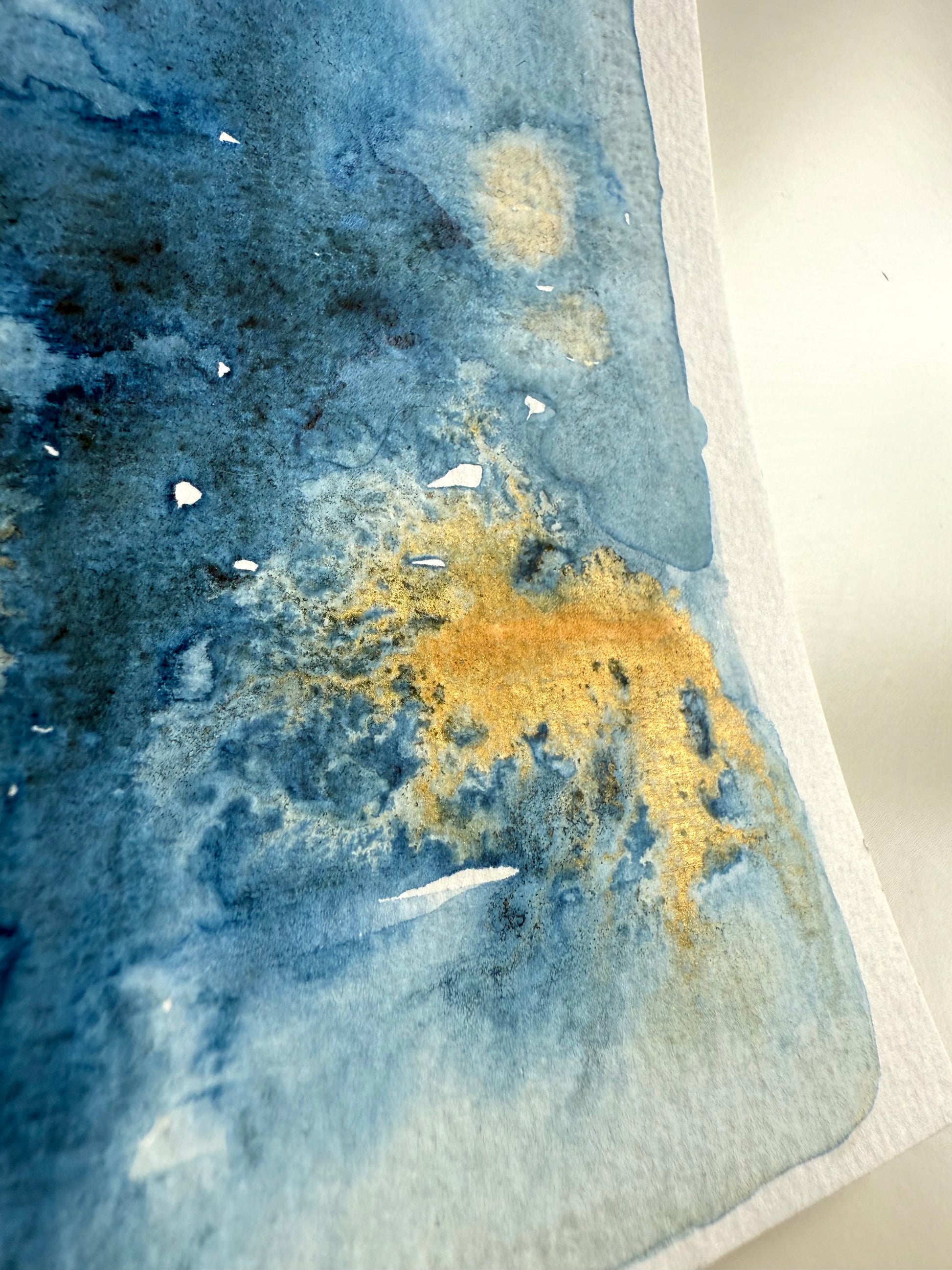 Pictată pe hârtie profesională pentru acuarelă, 300g, textură medie.